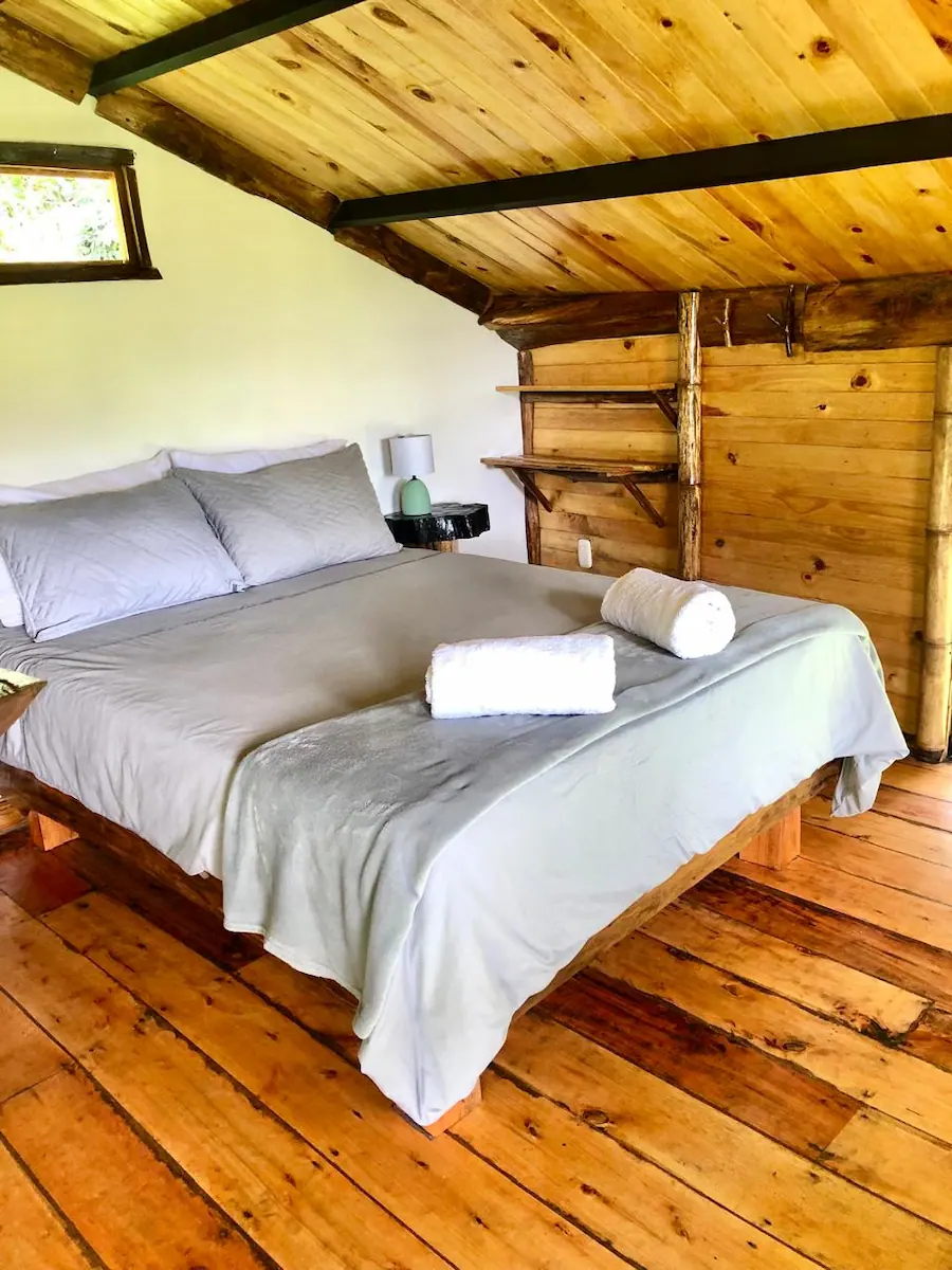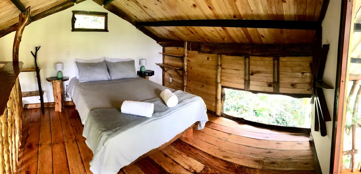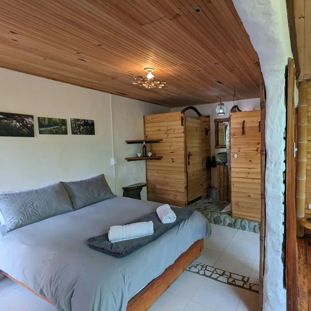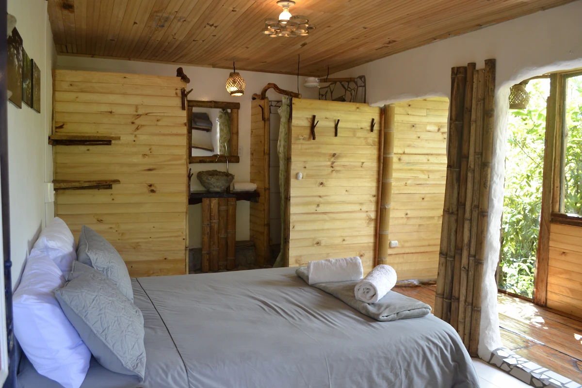 La finca Flora del Río ofrece tres habitaciones con cama doble y baño privado. Una de ellas tiene capacidad para tres personas, gracias a un sofá cama adicional. Cada habitación ha sido cuidadosamente diseñada para propiciar una conexión armoniosa con la naturaleza. Con detalles artísticos en su interior, son espacios de tranquilidad donde es posible escuchar el suave murmullo del río desde la cama.